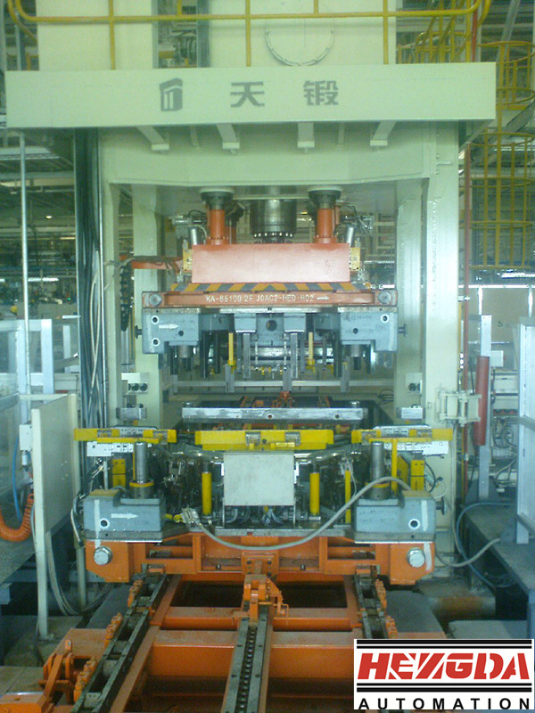 ?、谝慌_(tái)機(jī)器帶一個(gè)雙工位換模小車的結(jié)構(gòu),換模小車在機(jī)器后側(cè)左右移動(dòng)實(shí)現(xiàn)模具更換,在機(jī)器的左右側(cè)或前側(cè)布置上下料機(jī)構(gòu)。包邊液壓機(jī)的噸位小,臺(tái)面尺寸偏大,所以均采用雙活塞缸結(jié)構(gòu),以便均布液壓機(jī)的受力。為降低成本,在客戶沒有特別強(qiáng)調(diào)的情況下油缸及拉桿在技術(shù)協(xié)議中均取消鍛鋼的描述,而敘述為優(yōu)質(zhì)鋼材。包邊液壓機(jī)主要用于汽車四門兩蓋的門板的壓合工藝,噸位選擇一般為150-250噸,從我廠目前已生產(chǎn)的包邊機(jī)看,150噸、200噸的占所有產(chǎn)品份額的90%以上,其中又以200噸的居多,所以包邊液壓機(jī)的標(biāo)準(zhǔn)噸位定位200噸。汽車包邊模具的尺寸大部分在2000-2800mm之間,高度在500-1000mm之間,因此包邊壓機(jī)的工作臺(tái)有效尺寸按照3個(gè)檔次設(shè)置:3200*2800mm、3000*2600mm、2600*2400mm;包邊壓機(jī)的開口尺寸定為2000mm,行程1450mm,基本可以涵蓋所有包邊模具的使用。